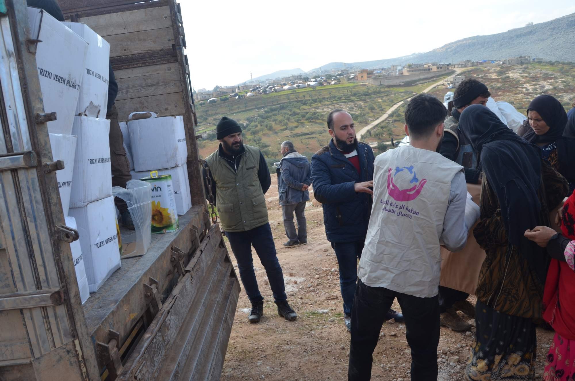 توزيع إسفنجات +حرامات +موكيت +وجبات طعام على عدة عوائل وقد بلغ العدد 80 عائلة من الأهالي المهجرين قسراً
